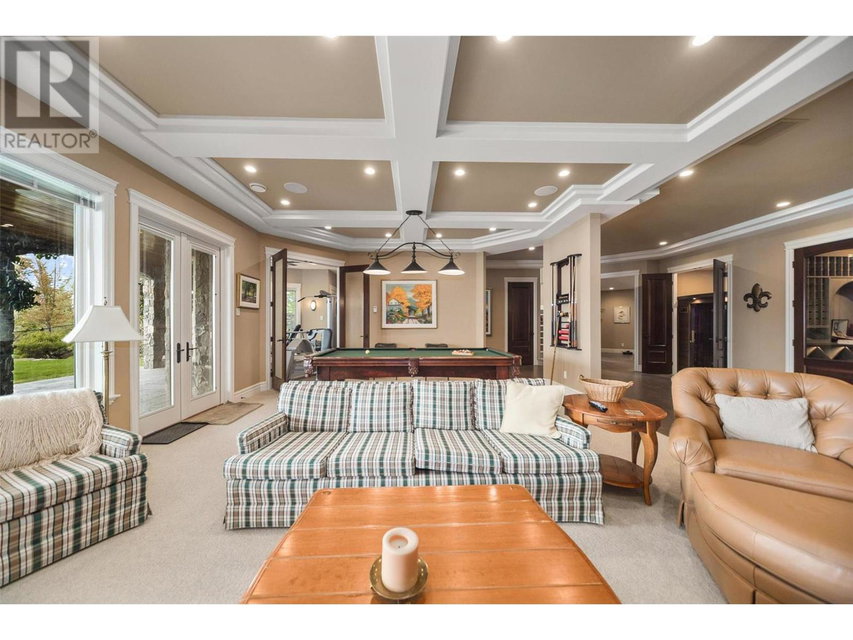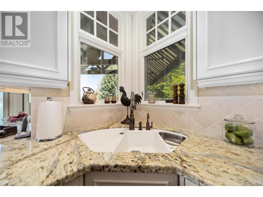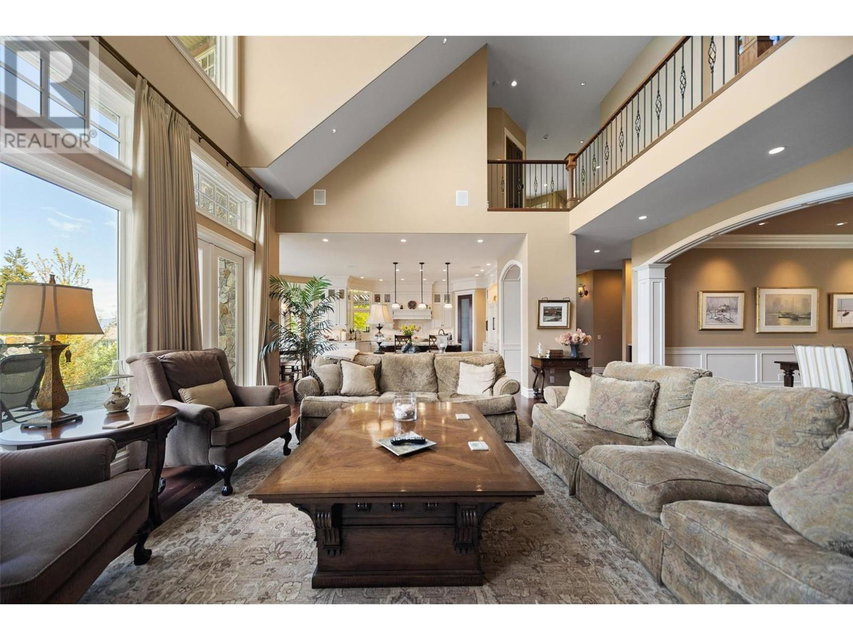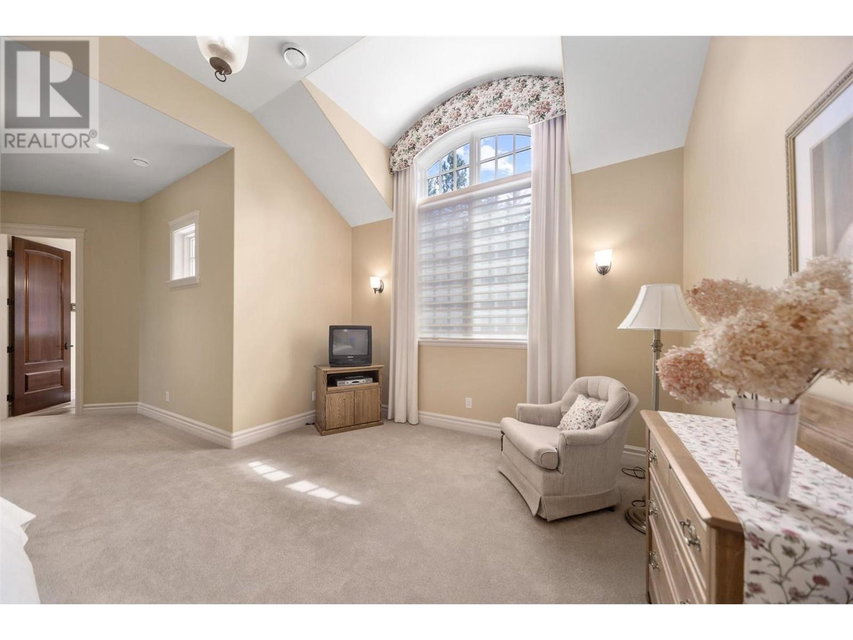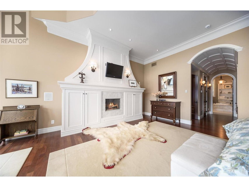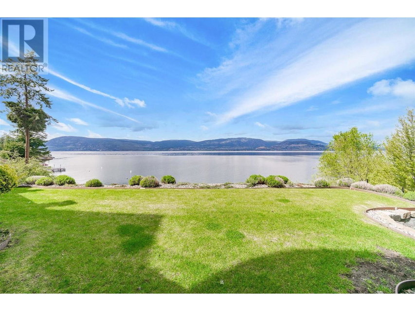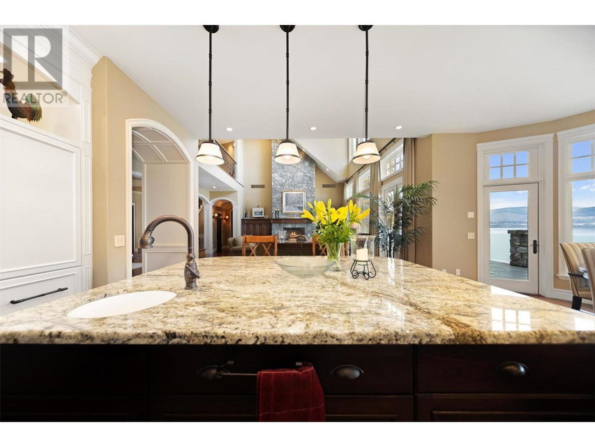 Lakefront vineyard estate home on 2.31 private acres w/160’ of sandy beach. State of the art geothermal heating/cooling and green living eco septic system. European chateau inspired boasts a new dock, elevator, wine cellar, private vineyard, office, gym + theatre. 8000 sq ft, 5 bdrm, 8 bath. Main floor primary suite w/ reading area + fireplace, luxury hotel like bath, great room w/soaring ceilings, stone fireplace and French doors that lead out to a lakefront patio w/ sunset views. The chateau kitchen w/ best in class Wolf/SubZero appliances, lakeview kitchen table along w/bar seating, formal dining room, main floor laundry and a wet bar round. The upper level w/2 large bdrms w/ensuites and huge family/guest suite w/ensuite, laundry, kitchenette. The lower level has a gym +spa bath, wine cellar, games rm, theatre, sauna, family rm and a large office w/ensuite. Elevator + accessible ramps. 4 car garage plus bonus storage. Explore your options to add a guest house. Outdoor kitchen/hot tub. Licenced dock w/power lift. Htd tile floors, Pella windows, state of the art water filtration/controls, htd driveway. Smart Lutron system w/power blinds, custom lighting, audio, alarm. Timeless design w/ tile roof, copper gutters and Kettle Valley stone exterior. A relaxing waterfall entrance. Private vineyard w/90 Chardonnay vines with room to expand vineyard. Mins to the award winning Cedar Creek + Martins Lake wineries, Bertram Park and the amenities of Lower Mission. Room for pool. (id:17834)