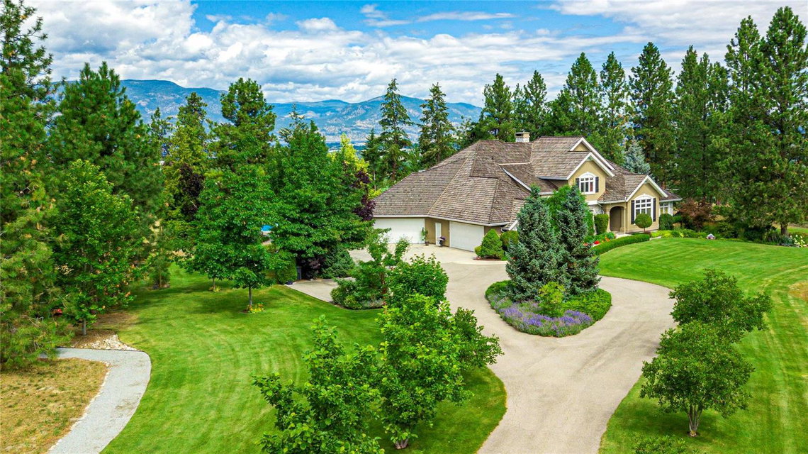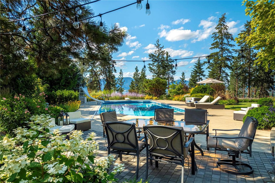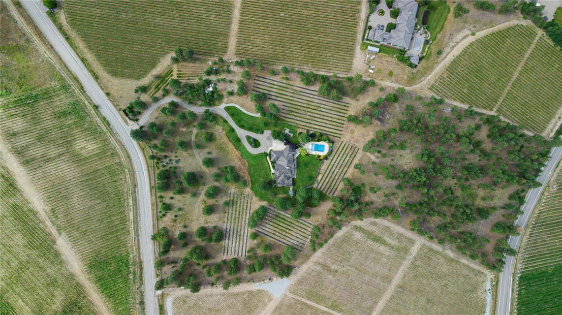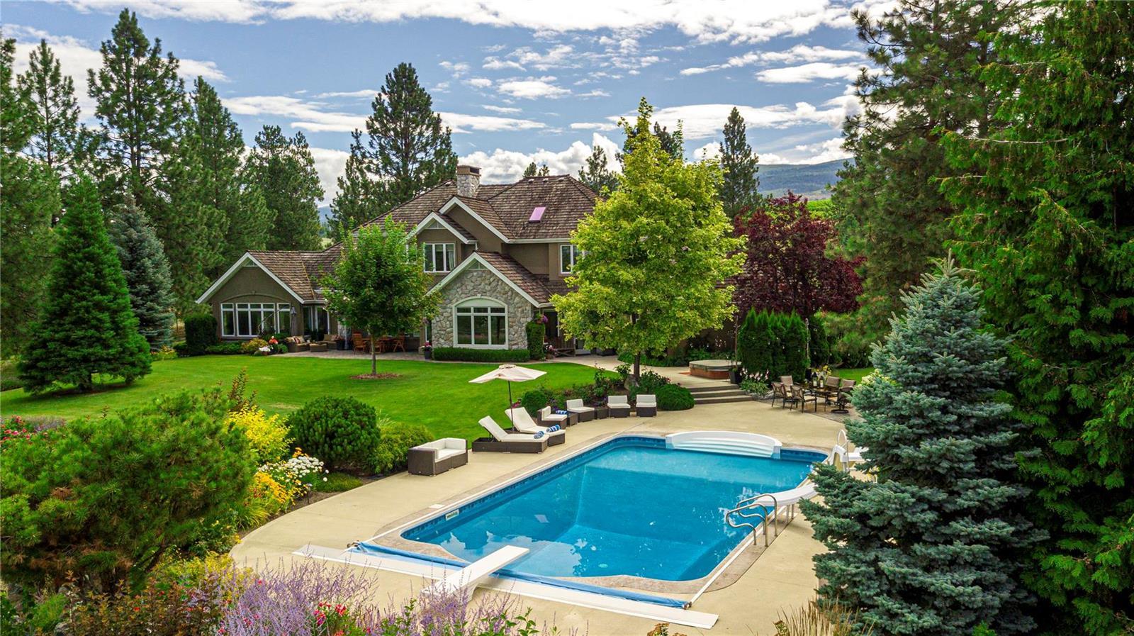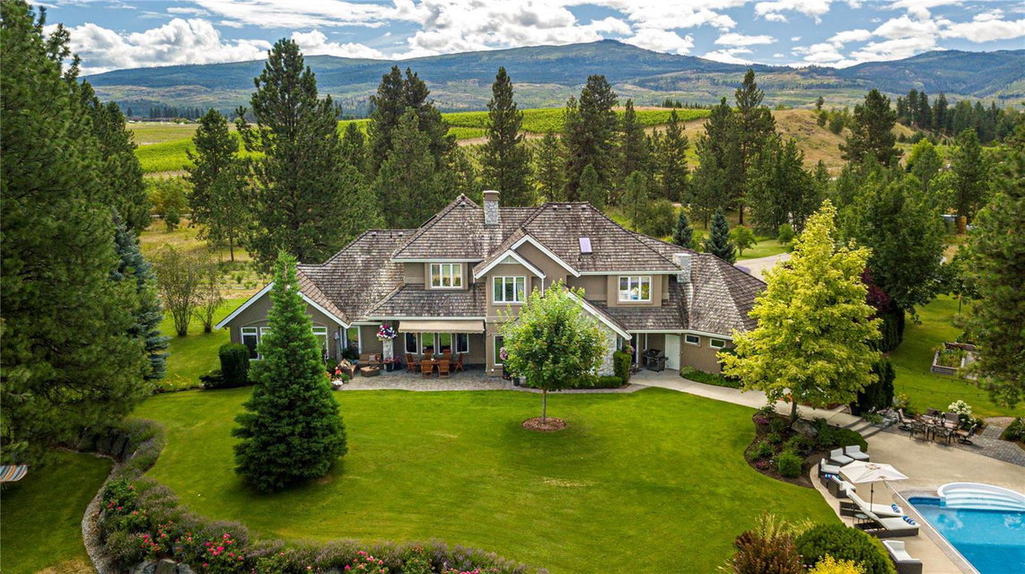 Arrive through the gate and wind your way down the driveway of this private 12 ac estate acreage and feel the stress disappear. Located in Kelowna’s sought after Crawford Bench only minutes away from the city+ lake this property is truly a lush retreat with a large pool, mature landscaping and a feeling of privacy and serenity. Live next to Quails Gate/ Mission Hill vineyard. 2 outdoor patios invite al fresco dining or for enjoying the calming green space. Inside, fall in love with the scale, quality and attention to detail in the 7 bdrm 7000 sq ft custom Fawdry built home. Highlights include a designer cherry wood kitchen with high end appliances, home gym, office, gift wrapping room, home theatre and a multipurpose/games room. Comfort meets luxury in a serene setting. Large master suite on main featuring bright corner windows w/ views of the forest, lake and valley + direct access to the patio/yard. Spa-like ensuite, walk-in closet . Upstairs is a family friendly layout with 4 spacious bedrooms and 3 baths and a study nook. Two additional guest bdrms + bath downstairs with a separate entrance. Four car garage, mud room/ laundry, workshop, oversized indoor storage. Geothermal system for the house heating/air conditioning, heating of the pool and the hot-tub. Room to park all your toys. Property currently features a boutique farm growing Haskaps and Raspberries and is ready to clear and plant 6 acres of vineyard. Farm status reduces property taxes. (id:17834)