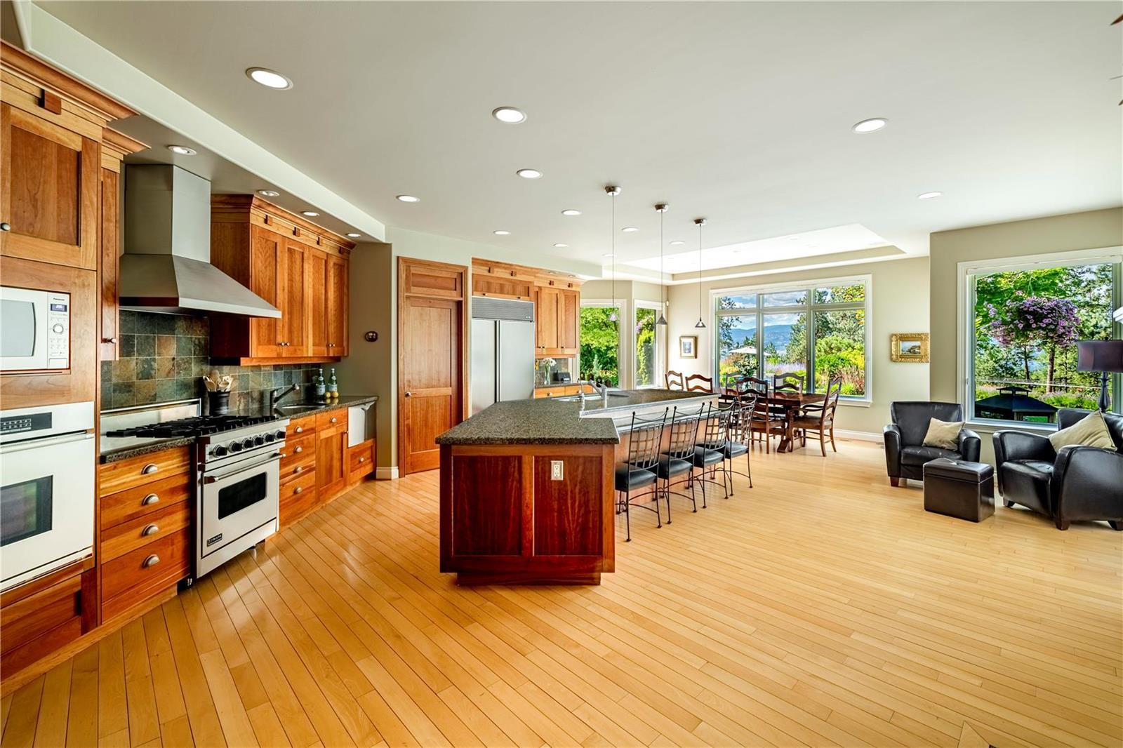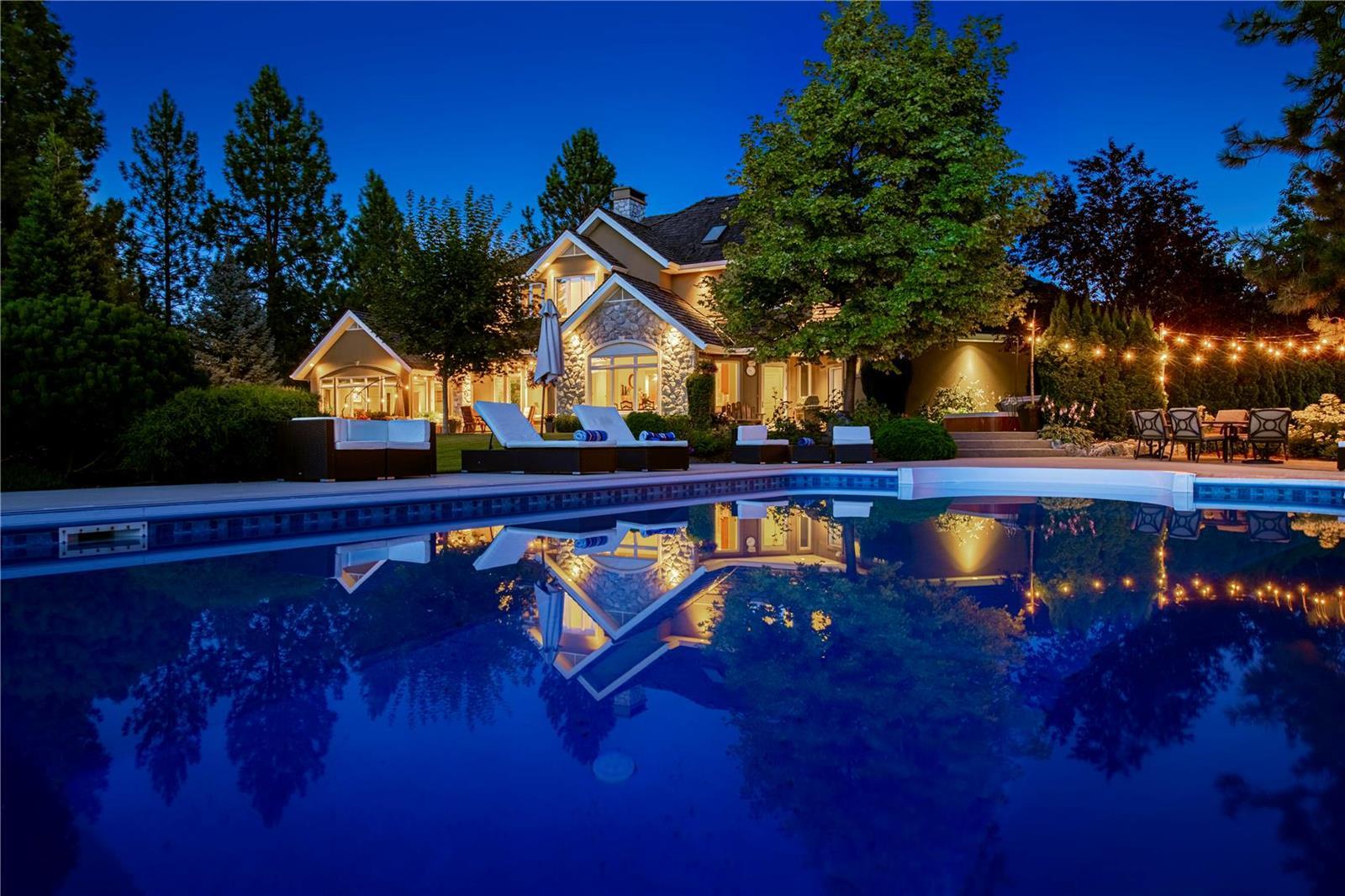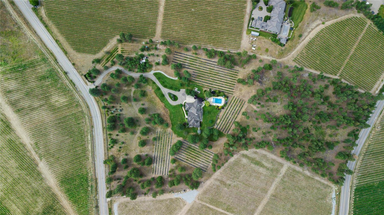 Arrive through the gate and wind your way down the driveway of this private 12 ac estate acreage and feel the stress disappear. Located in Kelowna’s sought after Crawford Bench only minutes away from the city+ lake this property is truly a lush retreat with a large pool, mature landscaping and a feeling of privacy and serenity. Live next to Quails Gate/ Mission Hill vineyard. 2 outdoor patios invite al fresco dining or for enjoying the calming green space. Inside, fall in love with the scale, quality and attention to detail in the 7 bdrm 7000 sq ft custom Fawdry built home. Highlights include a designer cherry wood kitchen with high end appliances, home gym, office, gift wrapping room, home theatre and a multipurpose/games room. Comfort meets luxury in a serene setting. Large master suite on main featuring bright corner windows w/ views of the forest, lake and valley + direct access to the patio/yard. Spa-like ensuite, walk-in closet . Upstairs is a family friendly layout with 4 spacious bedrooms and 3 baths and a study nook. Two additional guest bdrms + bath downstairs with a separate entrance. Four car garage, mud room/ laundry, workshop, oversized indoor storage. Geothermal system for the house heating/air conditioning, heating of the pool and the hot-tub. Room to park all your toys. Property currently features a boutique farm growing Haskaps and Raspberries and is ready to clear and plant 6 acres of vineyard. Farm status reduces property taxes. (id:17834)
